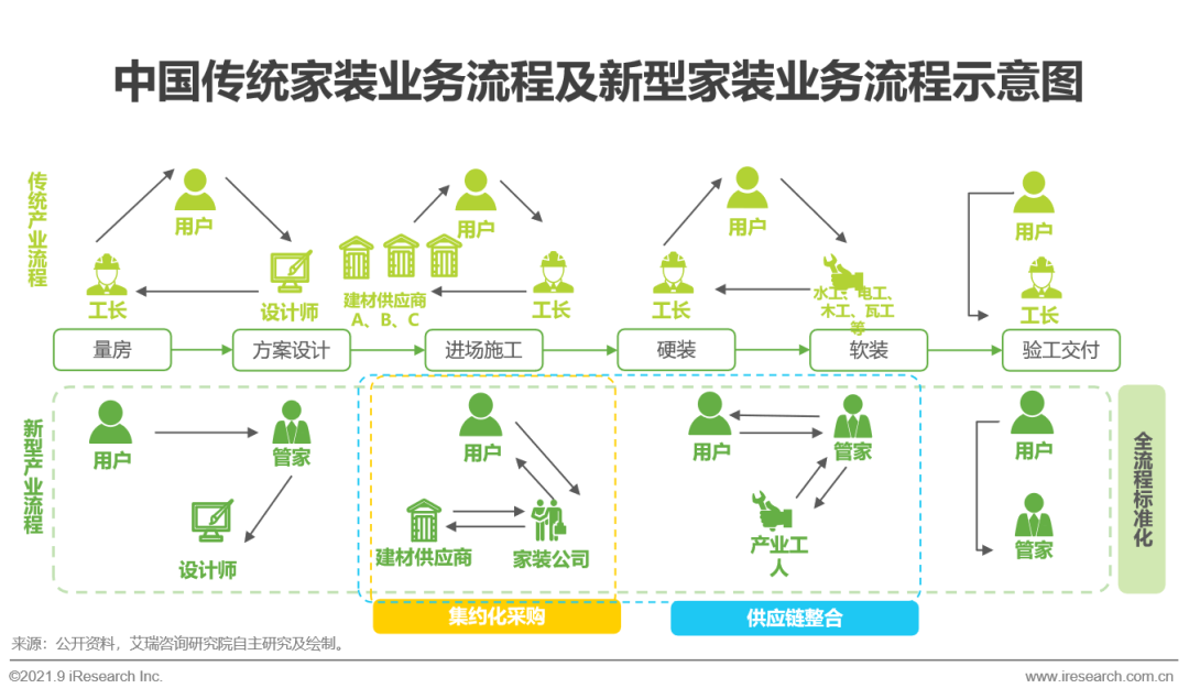 傳統的家裝業務的用戶體驗較差,主要有以下四方面原因:1)用戶需要接觸的流程環節較多;2)施工工人大多是個體,本身沒有統一的業務規範管理,用戶自己管理難度大;3)施工中主輔材價格和施工費用不透明並且大部分用材需要用戶自己去商議價格,支出不可控;4)最後交付環節中,用戶需要和工長、施工工人等多方進行驗收,管理難度過高。為了根本解決用戶在家裝過程中的痛點問題,頭部家裝企業通過集成化採購、供應鏈整合和業務流程規範的方式對家裝產業進行整體升級。1)通過集約化採購的方式解決了傳統家裝中間流轉環節加價的問題,並降低主輔材的採購成本和用戶議價難度;2)通過供應鏈整合方式提高工程方、建材供應商、施工團隊等參與主體間的業務效率,可以做到比傳統家裝三倍以上的經營效率。