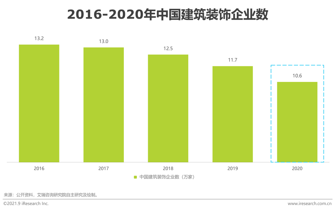 住宅裝飾和裝潢行業屬於建築裝飾業下的細分子行業,主要作用在於美化居住環境和提高住宅功能性,在同一住宅生命周期內可發生多次裝潢行為,使得家裝行業具備可持續性的特點,市場空間巨大。中國建築裝飾協會統計數據顯示,2020年中國建築裝潢行業企業數量為10.6萬,呈逐年遞減態勢,退出市場的企業以低資質小公司為主;但與此同時家裝企業集中度極低,龍頭企業營收均未過50億,市占率都低於1%。究其原因,家裝行業服務端從早期的施工隊、設計工作室,發展至裝潢公司,期間產生了升級更迭但絕非完全替代。時至今日,傳統家裝企業數量多且較為分散,區域型特徵明顯,缺乏統一的標準化施工流程,導致行業集中度較低。