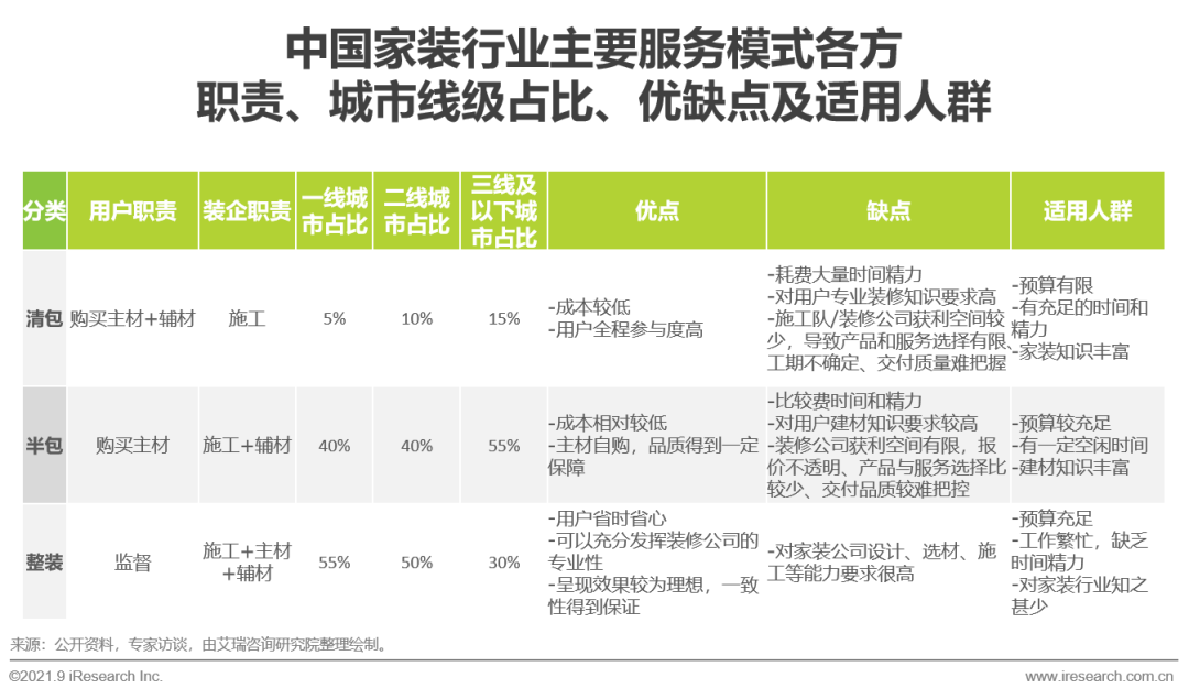 傳統家裝行業早期服務模式以清包和半包為主,裝潢公司提供的產品和服務較為單一,施工驗收標準也不統一,用戶往往需要花費大量時間和心力去和裝潢隊與建材商販溝通、議價,由於缺乏經驗和專業知識最終呈現的效果也往往不夠理想。隨著當今生活節奏加快,越來越多的用戶缺乏時間與精力去多方斡旋;調研結果表明,高線級城市用戶更加傾向於使用類似愛空間模式的一站式整裝服務,清、半包模式隨著城市線級的提升,市場占比出現明顯下滑。在用戶購買力升級和審美水平不斷提升的大趨勢之下,傳統家裝的服務模式已經難以滿足多變的需求,艾瑞認為未來標準化、專業化的整裝服務會成為大多數用戶的首選。