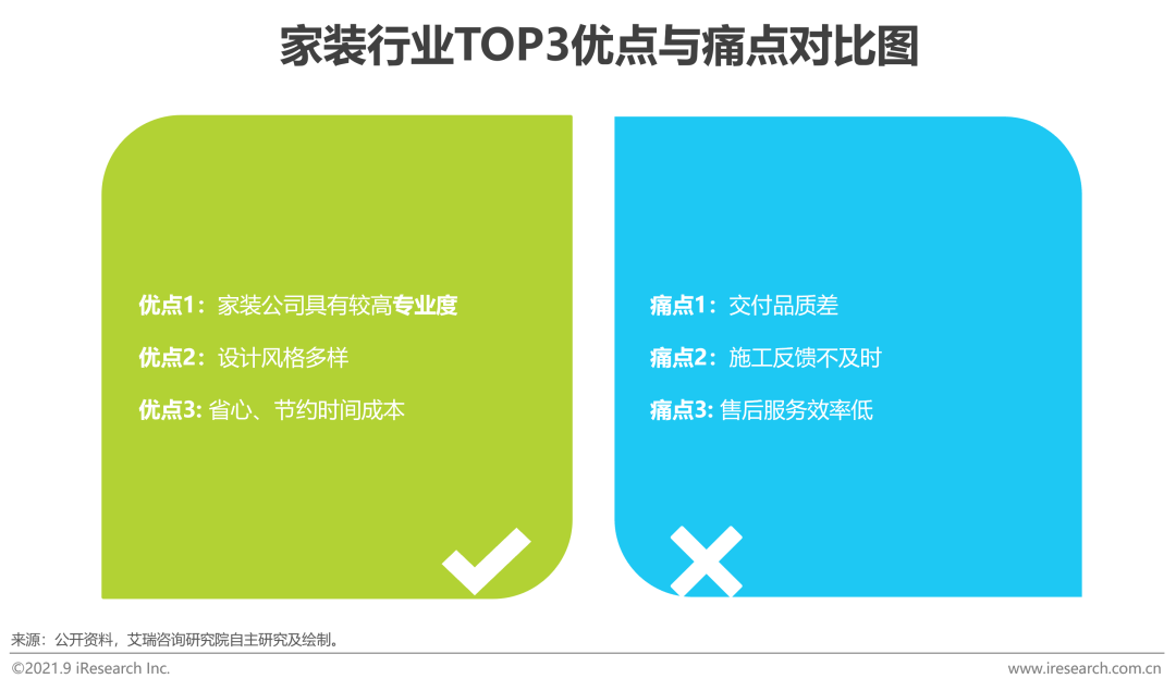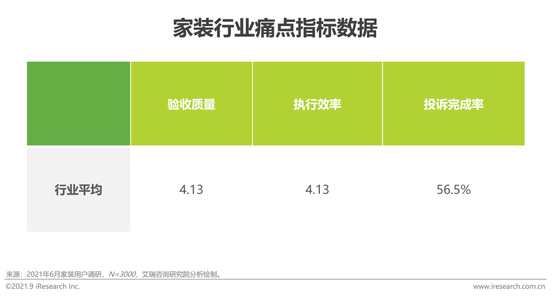 艾瑞調研數據顯示,消費者對於家裝行業整體較為滿意,但感到非常滿意的用戶僅占24.3%,同時行業NPS值為到57.8%,客戶滿意度和忠誠度都尚有較大進步空間。用戶選擇推薦的原因主要集中在專業度高、設計風格多樣和省心;而用戶評選不推薦的原因主要為交付品質差、施工反饋不及時和售後服務差。黑貓投訴平台數據顯示,業之峰、愛空間、東易日盛等垂直型家裝企業投訴量明顯少於土巴兔、齊家等平台型裝潢企業;以投訴處理效率來看,行業平均投訴完成率為56.5%,愛空間憑借高效的售後處理機制使投訴完成率高達94.4%。在調研企業中愛空間在驗收質量和執行效率指標上分別獲得4.29分和4.32分,均大幅超出行業平均水平。對行業痛點問題突出的解決能力使愛空間整體NPS值達到72.7%,在客戶端積累了良好的口碑。