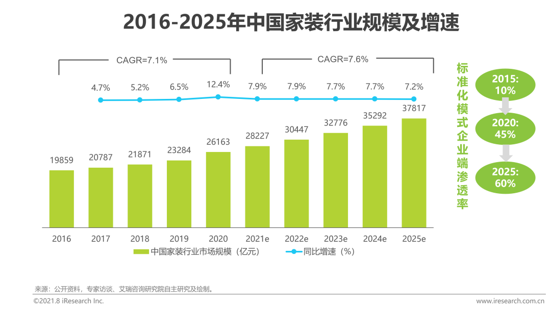 中國家裝行業基數大,發展較為穩定,2020年行業市場規模達26,163億,同比增長12.4%,隨著存量需求的不斷釋放和全裝配政策的激勵,2025年家裝行業市場規模預計將達到37,817億。自2014年以來,以產品、交付、服務標準化為核心的一站式,運用標準化模式的企業在2015年僅有10%,隨著競爭格局加劇於2020年提升至45%,並在2025年有望達到60%,標準化整裝市場發展前景廣闊。