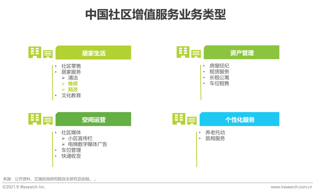 在高線城市房地產市場由增量房向存量房競爭的背景下,家裝市場需求也逐漸由新房裝潢向舊房改造過渡,由此催生了基於居民生活場景的社區增值服務,業務類型主要涵蓋居家生活、資產管理、空間經營以及個性化服務等。包括恒大物業、保利物業、綠城服務等在內的眾多物業服務企業紛紛入局,由傳統物業管理向社區增值服務轉型,開辟第二增長曲線。家裝企業應當以用戶基礎作為底層優勢,充分整合內外部資源,創新多元、優質的社區增值服務,尤其是局改、維修等具備競爭優勢的業務,系統構建家裝後市場社區增值服務體系,從而精準匹配用戶家裝後需求,挖掘全新差異化盈利增長點,在此方面,貝殼、愛空間等巨頭已著手布局。