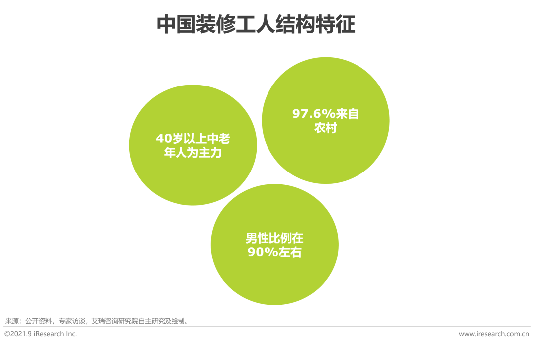 傳統的施工團隊通常由包工頭帶領散工組成,專業度和紀律性的匱乏導致了施工效率低下、技術不過關等弊病。行業發展過程中產生了工長制,一定程度上增強了紀律性,保證了基礎的交付能力,但施工質量與效率低下的問題仍未得到根本解決。職業化產業工人即經過嚴格的標準化施工體系培訓,並通過信息化系統進行規範化管理的工人。旨在從根本上解決行業服務能力弱和交付品質差的痛點,並且幫助工人在勞有所得、收入得到保障的同時獲得用戶的認可感和尊重感。從工人結構的角度來看,當下裝潢工人有中老年人居多、男性占比重、農民工為主的特徵,產業工人的普及將有利於調動青壯年勞力力的積極性,均衡工人組織結構,從而做到工藝的傳承。然而,產業工人滲透率在2020年僅有10%左右,由於前期投入大,收效時間長,許多企業僅採用工長制。從2014年愛空間布局直管工人模式,到2020年12月,公開資料顯示愛空間已做到全國在編產業工人6,806人,入職兩年以上人數占比46%,為行業帶來正面的帶頭示範效果,有利於進一步推動產業工人的普及。