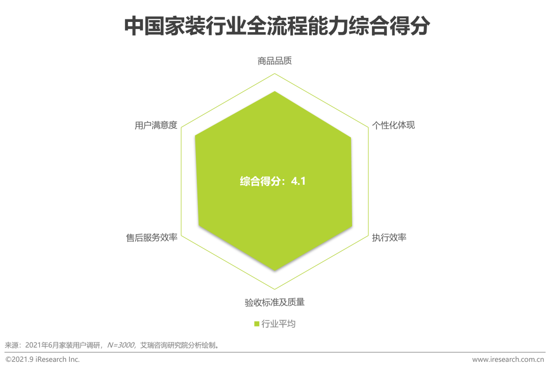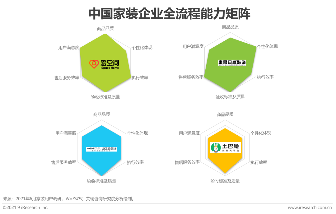 通過對商品品質、個性化體現、執行效率、驗收質量、售後服務及用戶滿意度等全流程核心指標的比對,艾瑞調研數據顯示家裝行業整體綜合評分為4.1,尚有較大進步空間。代表企業中,垂直類家裝企業對全流程能力的品質把控普遍高於平台類家裝企業。東易日盛在個性化體現、售後服務效率和驗收標準及質量等方面的能力受到用戶認可;愛空間在商品品質、驗收質量、執行效率和用戶滿意度維度在所有調研家裝企業中占有優勢。
