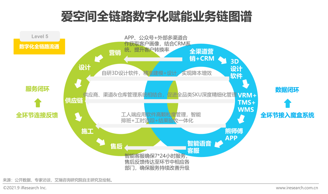 如前文所提,達到L5-數字化全鏈路流通意味著企業真正做到了數據與服務閉環相結合。愛空間憑借強大的IT團隊和大量研發投入,以「點-線-面」的方式不斷進行技術升級及改造,在行銷、設計、供應鏈、施工和售後各節點布局數字化產品,並通過自研「魔盒」系統將所有數據環節串聯、緊跟業務流程,率先做到數字化對業務鏈全流程賦能升級。