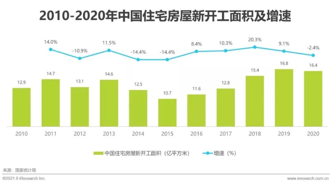 上世紀90年代末大陸房改制度全面推行,房地產行業蓬勃發展,2010年至2020年,大陸商品房銷售面積除2014年相較2013年出現輕微下降,其餘年份均同比增長,十年間積累了大量住房庫存,同時近三年來大陸年均新開工面積維持在16億平方米上下。持續韌性的地產建設和地產銷售對房地產投資起到一定的帶動作用,為家裝行業奠定了夯實的產值基礎。