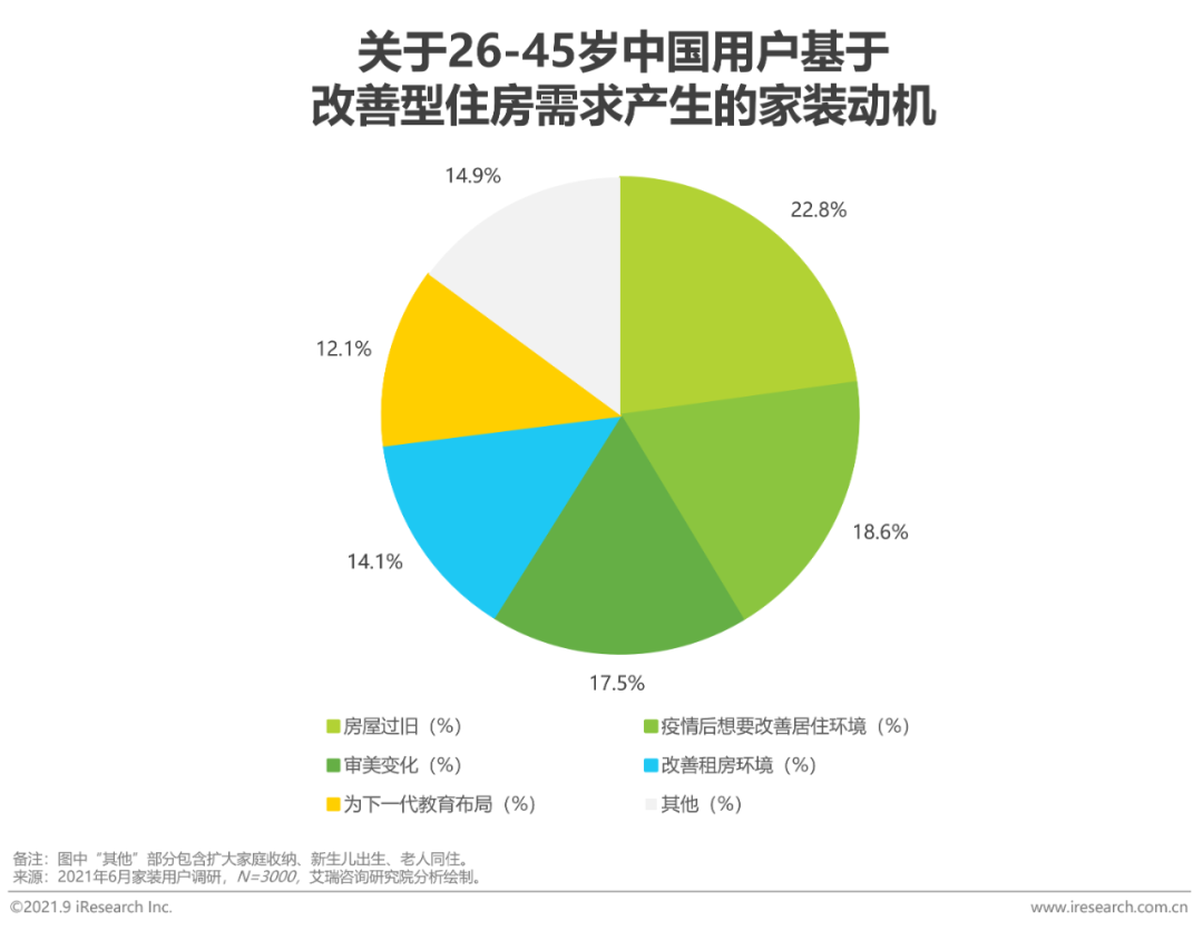 以整裝頭部企業愛空間為例,26-35歲用戶占比達到36.7%,36-45歲用戶占比達到31.2%,26-45歲用戶占比超過65%,80後、90後逐步成為家裝市場的重要消費群體。相比於老一輩的消費觀念,新消費群體具有較高的品牌意識,對於整體服務的質量要求更高,更加關注家裝公司產品的口碑。艾瑞調研發現,基於改善自身住房狀況的年輕用戶群體(26歲-45歲)占比達到48.3%,其中,房屋過舊(22.8%)、疫情後想要改善居住環境(18.6%)和自身審美變化(17.5%)是前三個主要因素。