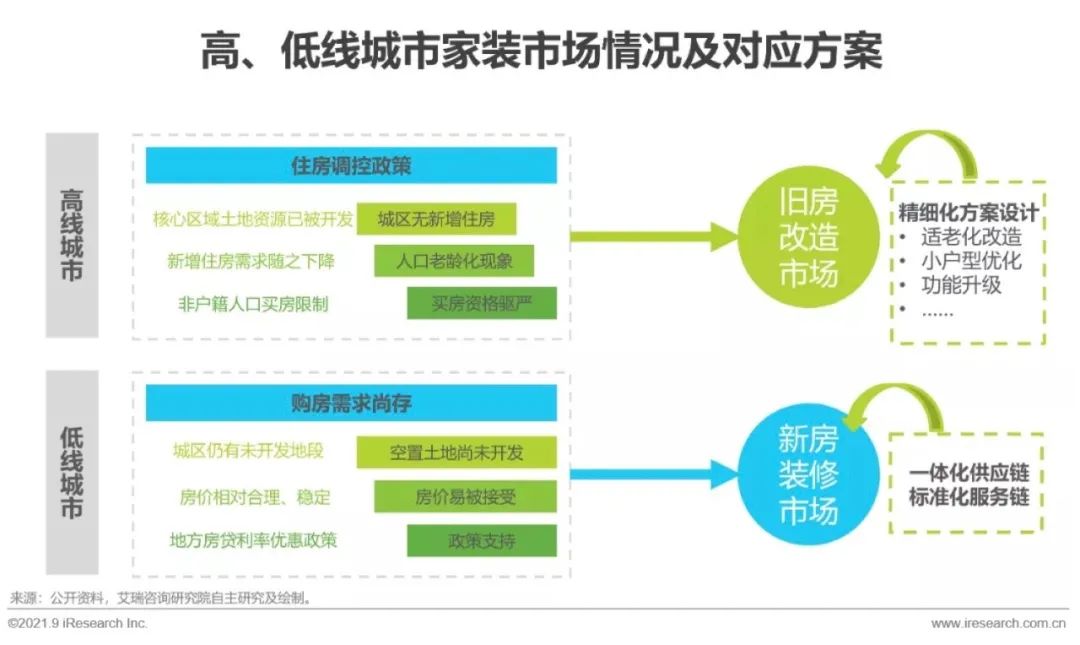 針對高線城市土地資源有限、人口壓力大等問題,國家出台一系列房地產調控政策,新房裝潢市場空間也因此逐漸收窄,但是舊房改造市場仍有較大發展潛力。近期頒布的鼓勵三胎政策進一步推動了消費者居住功能升級的需求,艾瑞相信對相應客群提供有針對性的精細化設計方案會是未來舊房改造市場的關注重點。三線及以下城市受政策激勵和城市發展需要,新樓盤開發仍在不斷增加,因此新房裝潢市場會逐漸向低線級城市發展,但是由於低線城市的家裝企業大部分尚未建立標準化的供應鏈和服務鏈體系,因此對於這類家裝企業,應當加快標準化進程,練好紮實的「基本功」,以應對管道下沉。