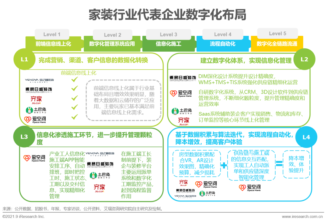 家裝企業數字化水平可由低到高劃分為5個等級,初級前端信息線上化隨著技術應用的不斷成熟已在行業端普及,艾瑞認為只有當企業數字化能力達到L5水平才從真正做到數據鏈對業務鏈的全環節有效賦能。