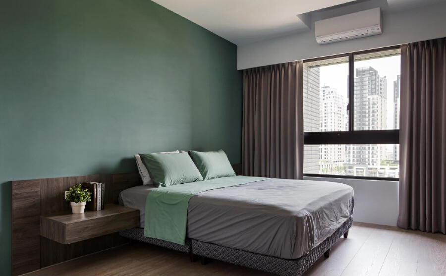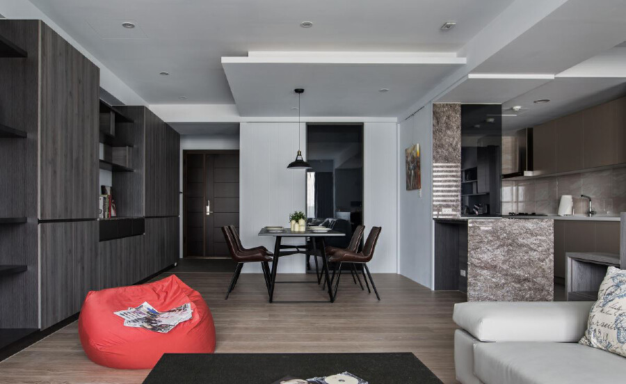 整體以白色作為主調,搭配簡約洗鍊的深色木皮、彩色軟件的適量提點,以及窗戶引入的溫暖采光,創造舒適的生活格調;同時針對貓咪喜愛爬跳的習性,運用櫃體流線結合長短不一的展示層架,爭取可讓貓咪自由活動的空間,而位處沙發後的書房也僅架高地坪、模糊與客廳之間的界定,成就寬廣、互動性佳的公共視野,天花板則保留原始梁體結構,但巧妙加入幾何型式的錯落高低,使天花不再突兀壓迫、變得有型利落;廚房入口藉由黑鏡打造門片,不僅阻擋油煙,亦透過材質透亮特性兼顧時尚美觀,一旁善用空間打造小巧吧台,且精選石材,以大地色呼應木質紋理,兼具廚房備菜與輕食功能;寢臥內,為了不做過多的裝潢,以色彩點明主題,在大面積的綠色揮灑之下,譜寫輕快的空間情調!