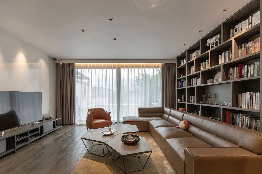 客廳沙發往前挪動大約0.5米,定制一組大書櫃。不僅可以滿足夫妻學習需求,還能為孩子營造良好的氛圍。