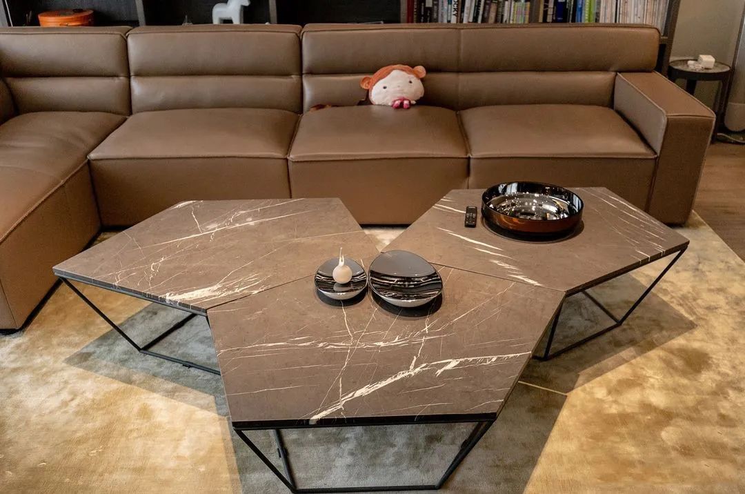 L型的精致皮沙發,搭配帶有天然石紋的異形茶幾,客廳顏值在線。