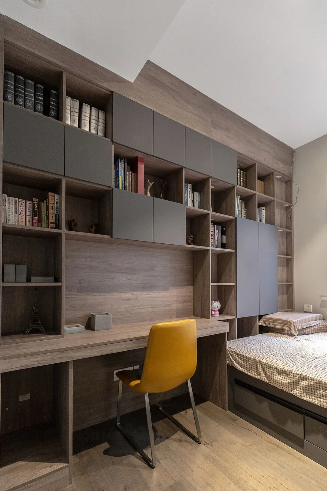 兒童房定制榻榻米地台床,一體化書桌櫃設計,功能強大。櫃體有藏有露,使用方便,還富有層次感。