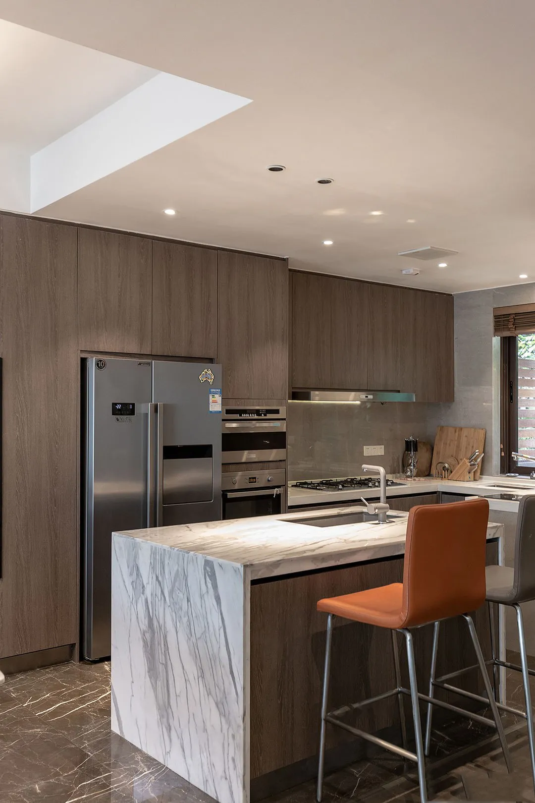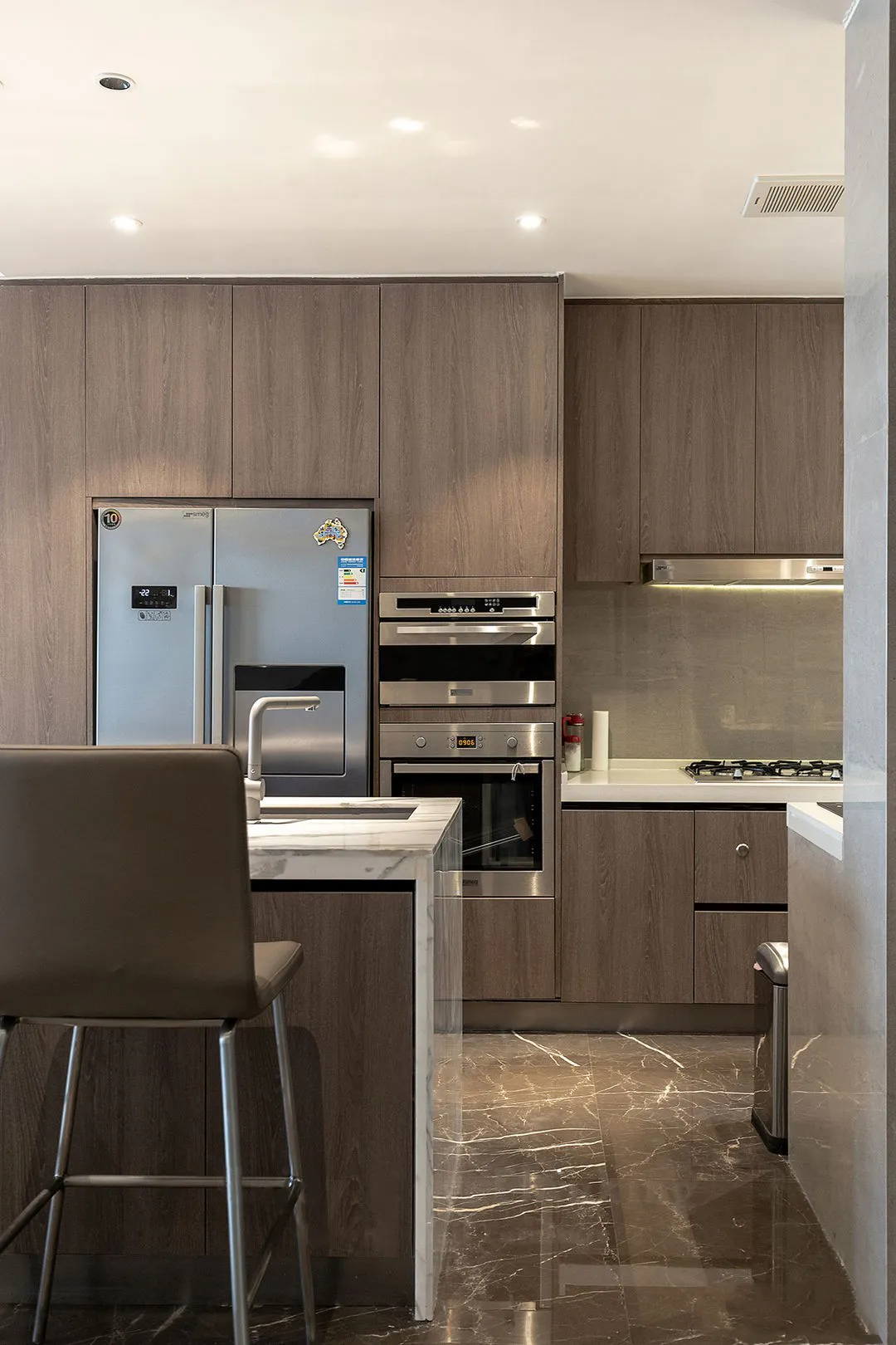 大櫥櫃中嵌入冰箱和蒸烤機,空間整潔有序,使用也方便。
