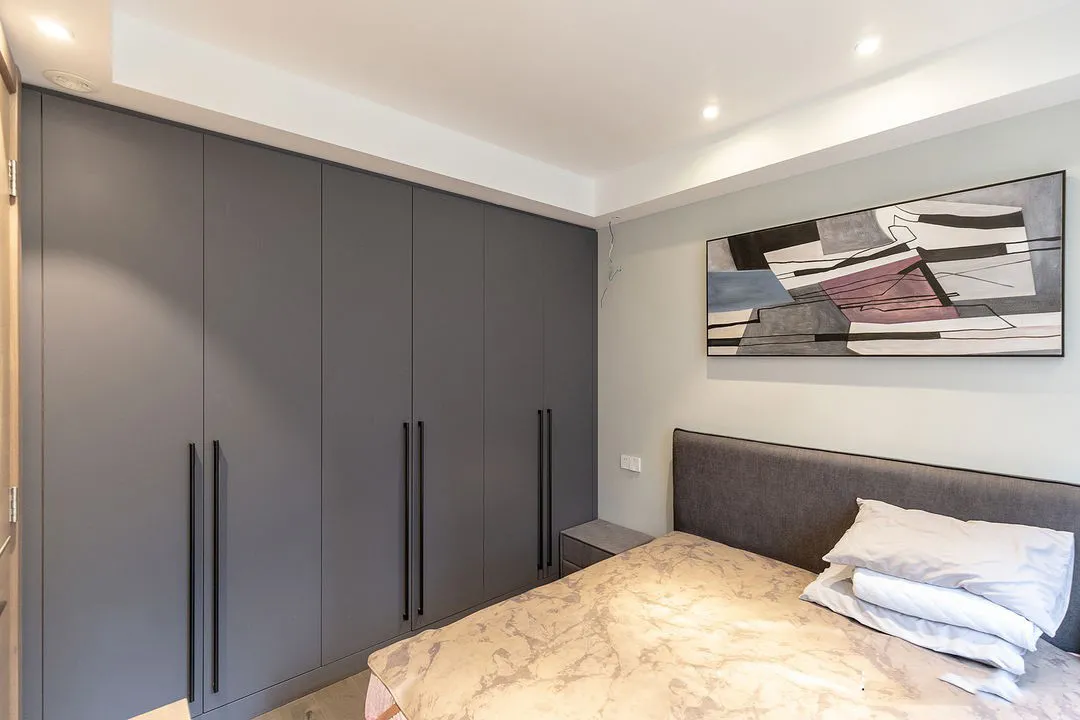 次臥延續全屋風格,簡約時尚。嵌入式衣櫃設計,深色的櫃門搭配黑色的隱形拉手,質感滿滿。