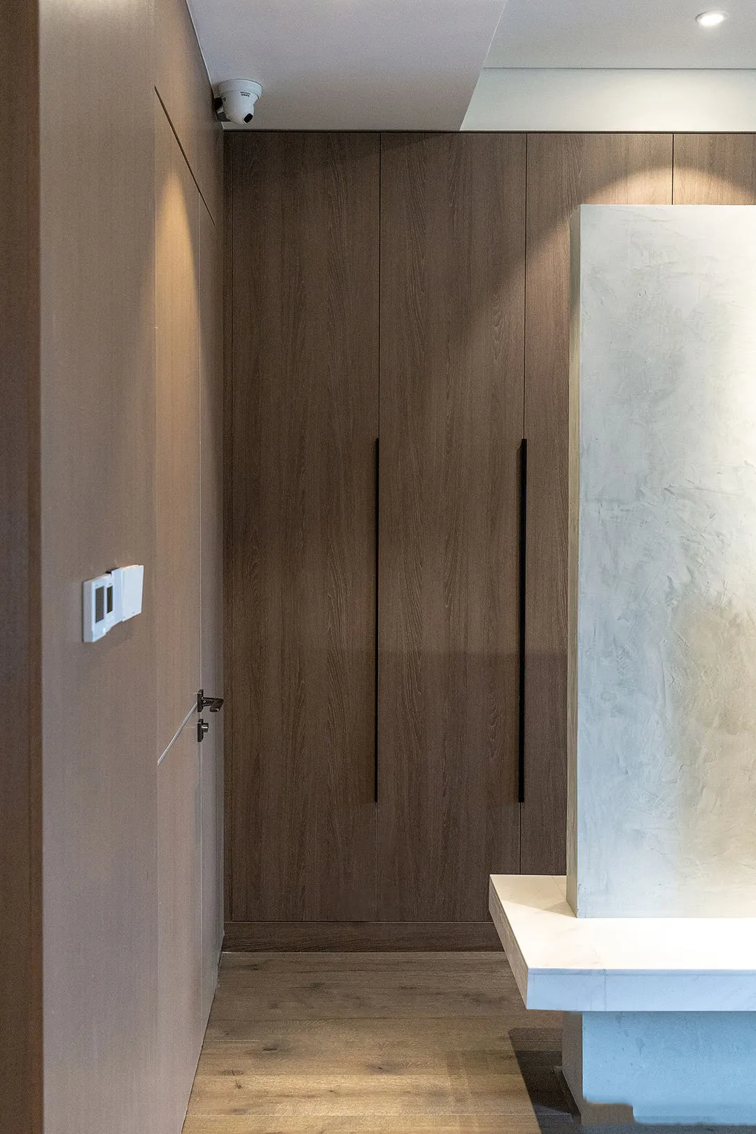 電視牆後面是衣帽間,大面積衣櫃收納衣帽鞋襪,滿足女主人的需求。