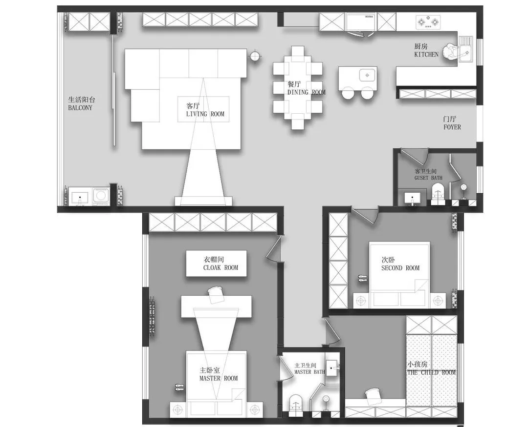 原戶型為四室兩廳格局,一家三口居住。為了滿足女主人的儲物需求,打通主臥和相鄰的次臥,設計衣帽間,四房變三房。