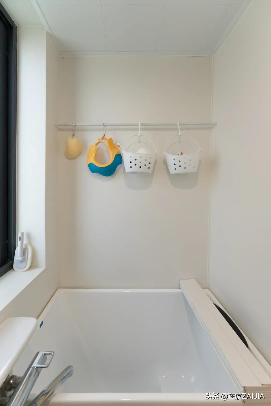 小浴室內剛好能容納一個60cm深的杜菲爾日式深泡浴缸,牆面的壁掛桿是屋主後期自己加的,每次孩子們洗完澡,海綿、玩具、浴帽都要及時晾乾,有了這個壁掛桿反倒方便了。