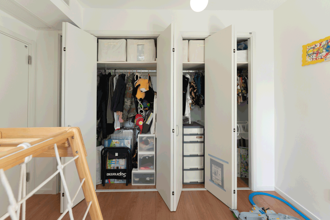 空間內一整牆的儲物櫃,可用來收納小朋友的過季衣物和玩具,折疊門關起,能瞬間恢復整潔。