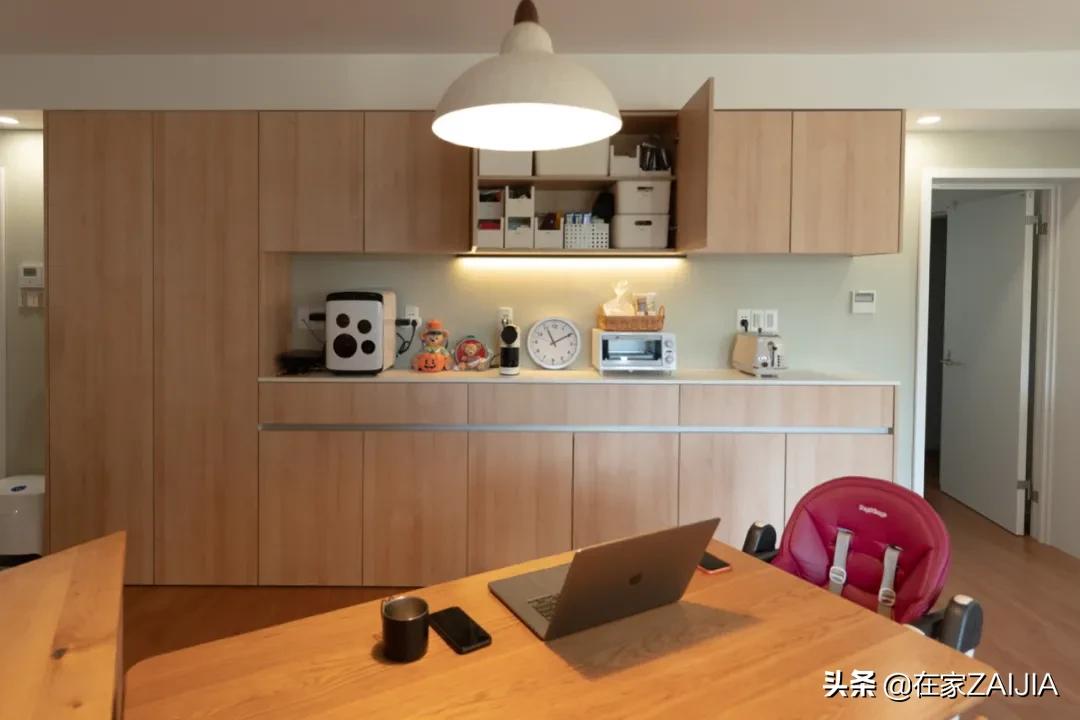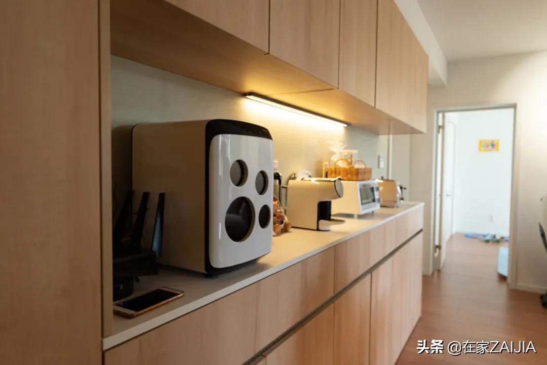 餐區則定制了一整面餐邊櫃,中間預留小家電收納區,因為廚房是獨立的封閉式空間,完全不用擔心油污問題。