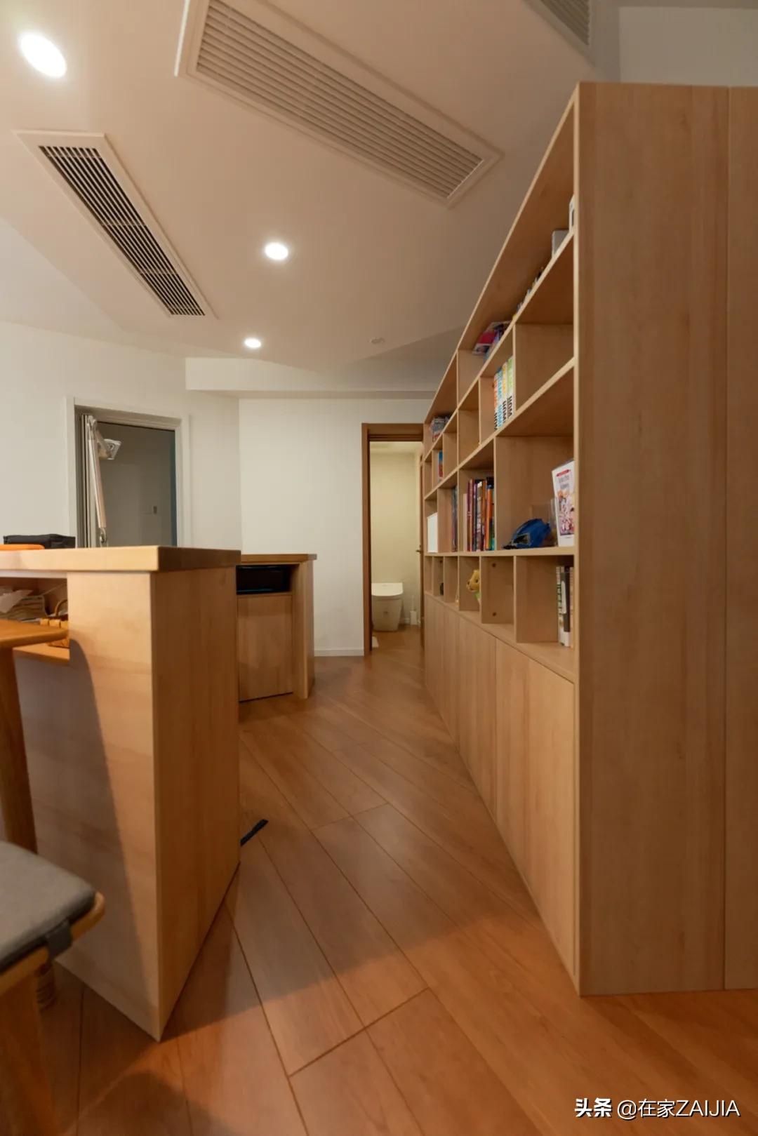 島台的書櫃是雙面向的,通過這個櫃體,也在原本開門見客廳的布局中,隔出來個獨立玄關。