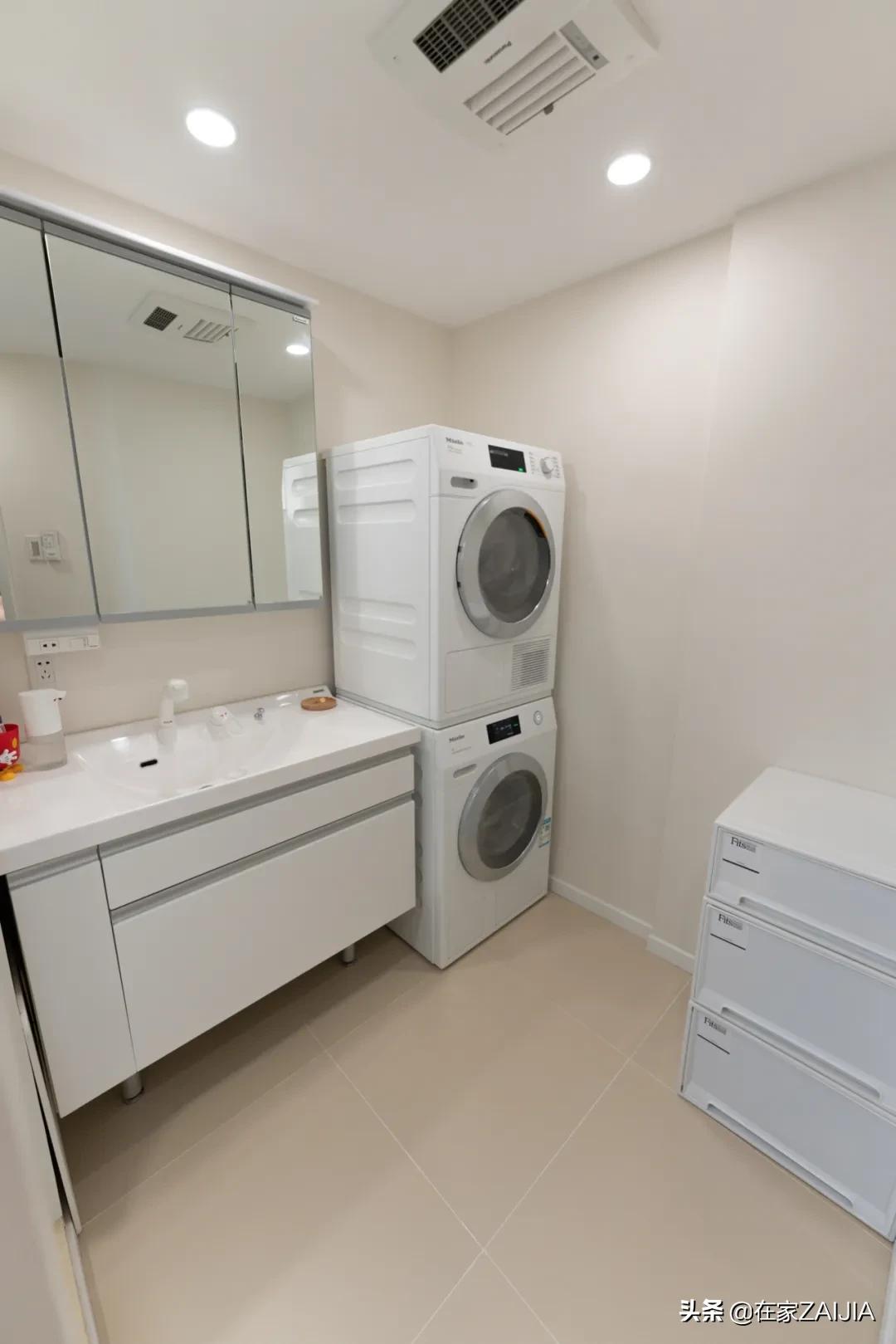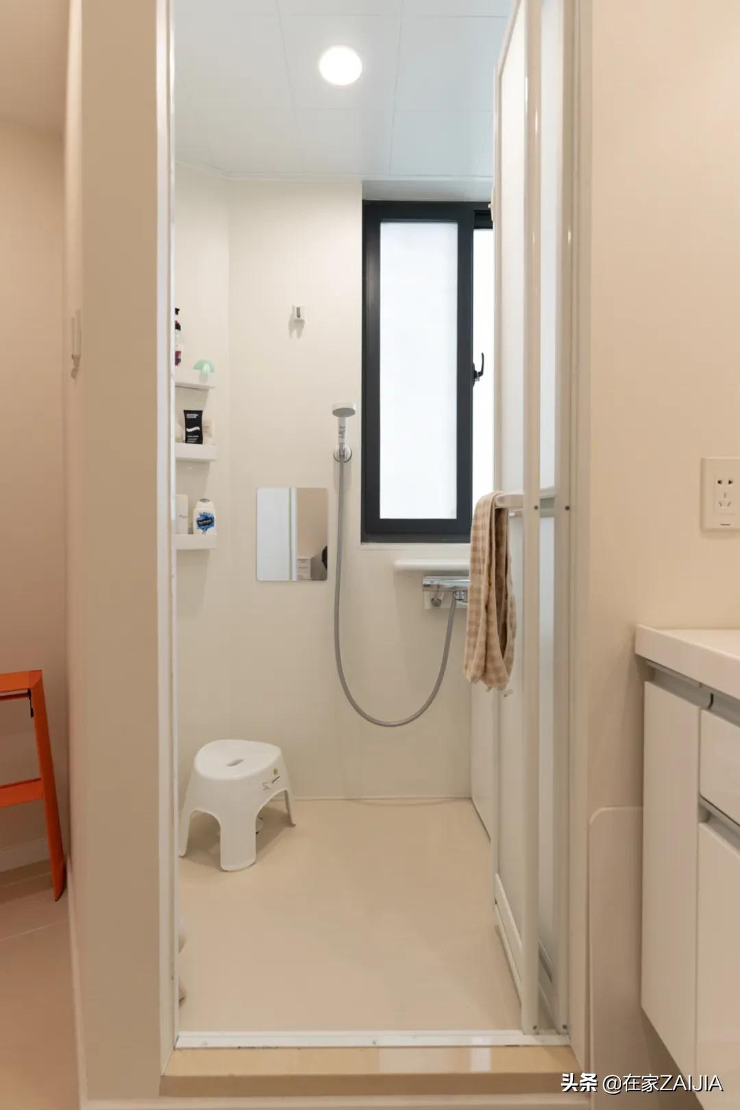馬桶間旁邊就是獨立盥洗區和浴室,盥洗區結合了洗漱和更衣兩種需求,洗完澡換下的髒衣服能直接丟進洗衣機清洗。