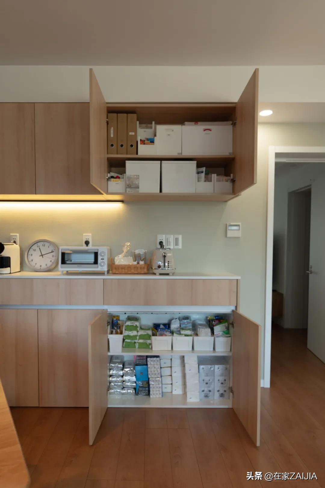 像抽紙等日用消耗品可以放在下層收納,方便拿取,上層作為囤貨區,搭配收納盒分類規劃,標註好日期,方便管理。
