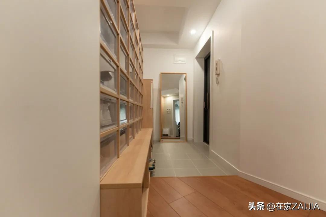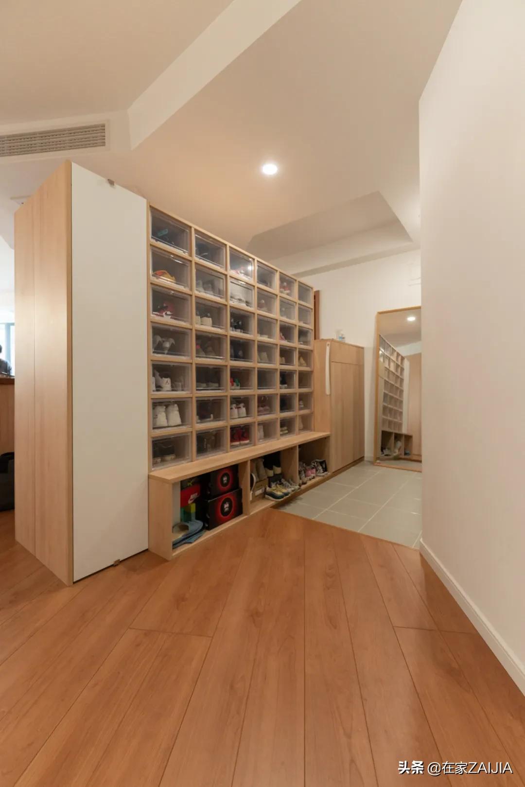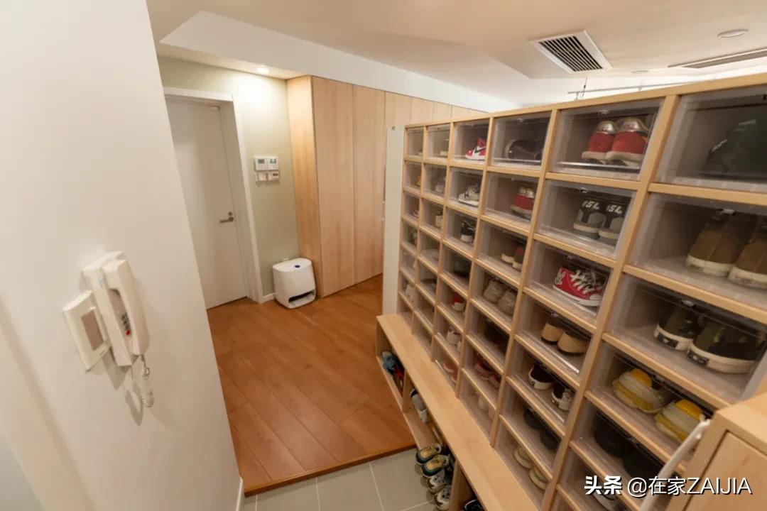 按屋主的話說,二胎家庭出個門,每次都像打仗一樣,鞋子找不到或穿錯是常事,考慮到屋主家鞋多,特意在玄關做了整面透明鞋櫃牆。