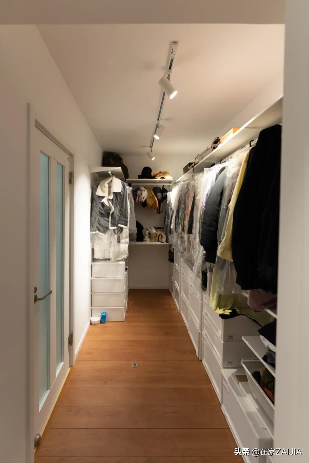 衣帽間內,宜家BOAXEL收納系統與天馬抽屜收納箱靈活搭配,夫婦倆的衣服基本能全掛起來。