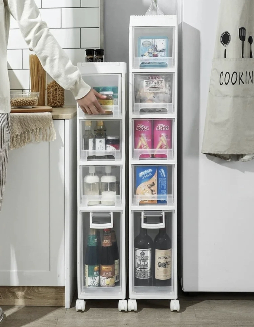 將收納進行到底!充分利用廚房里的零碎空間,縫隙收納架可以放置在冰箱間隙中,鏤空的設計既不會影響電器散熱,也能放置不少雜物,容量很可觀。