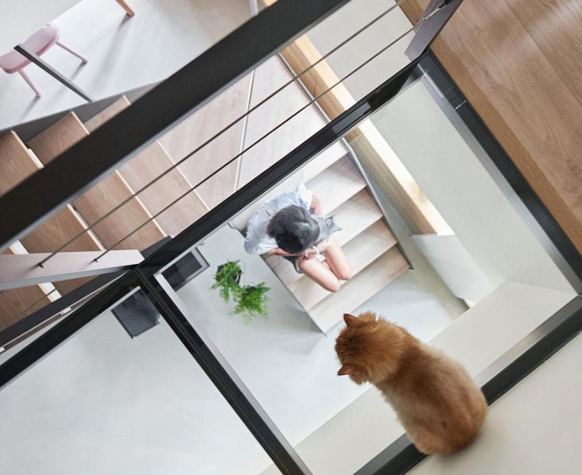 在臥室前方的走道,採用 1 + 1 的雙層膠合玻璃創造空橋,增加光線相互流通,並且加裝軟墊片,就算因為地震爆裂碎片也不會散落滿地。