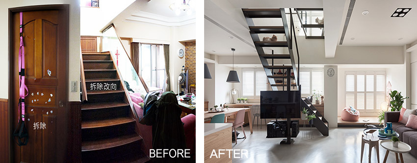 原來樓梯的位置在入戶門的一側,整體給人感覺相對比較擁擠局促。改良後的樓梯通過黑鐵設計搭配木頭踩踏板,呈現輕盈且可穿透的視覺維度。