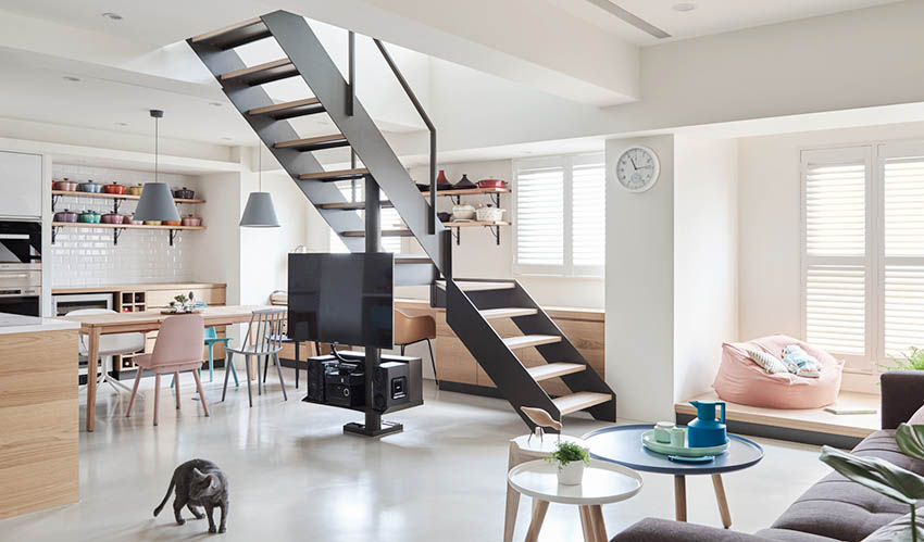 這樣設計一層整體空間就完全被打開了,孩子們也擁有了更多的活動空間。取消了電視牆,將電視利用可旋轉鐵柱,安裝在樓梯位置,無論在家中何處都能一同觀賞,美觀又實用。