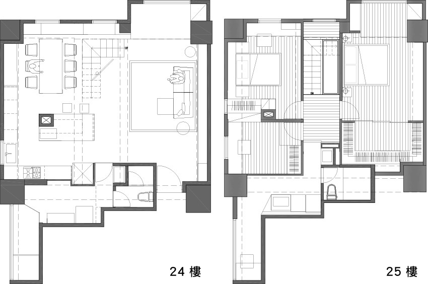 戶型格局3房2廳2衛,居住人數2大2小3小貓,一層在24樓是客餐廳,二層在25樓是睡眠休息區。整體戶型較為周正,布局開放且合理。