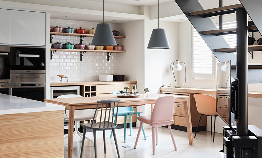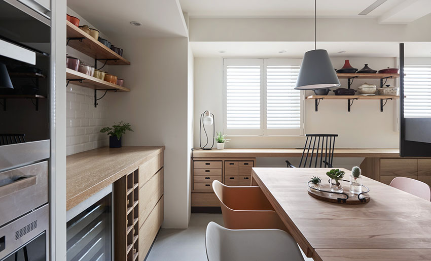 後方兩側設計為備餐餐櫃,擺放不下的餐盤也能挪移到櫃體上,更加方便使用。另外窗戶旁邊也增加定制長桌成為孩子的書桌閱讀區,方便媽媽做料理時就近照看。