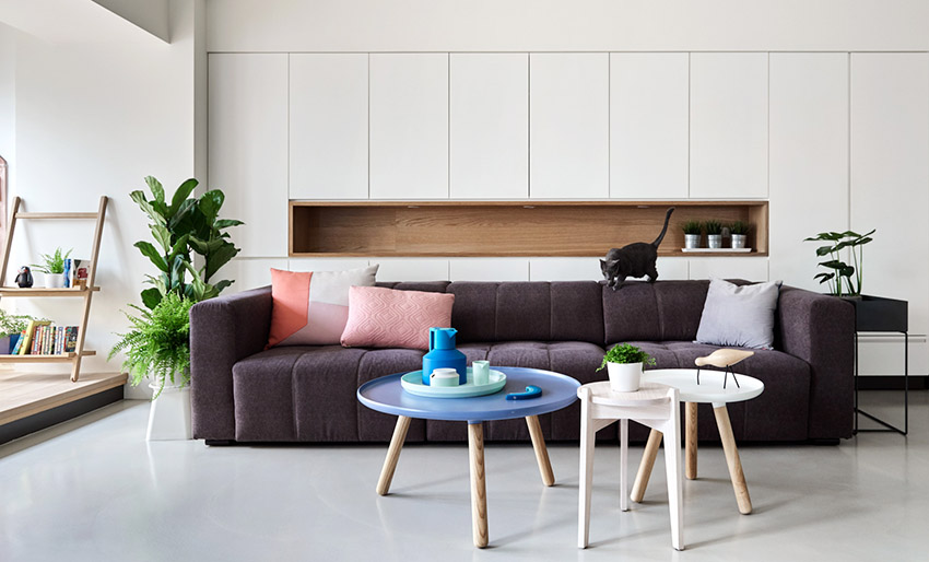 沙發背景牆做了一整排的隱形收納儲物櫃,最大限度地增加儲物能力。同時,中間留空部分可作為展示區,白色和原木色的搭配也是非常經典且溫暖的選擇。