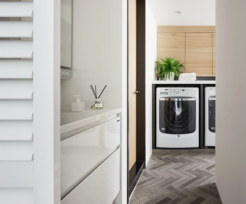 利用原本後陽台區域順勢規劃為洗衣房,仍舊保有曬衣空間可自由運用,並增加手洗衣物的洗手台。地板則使用人字拼貼木紋磚,接續室內木地板的溫潤視覺。