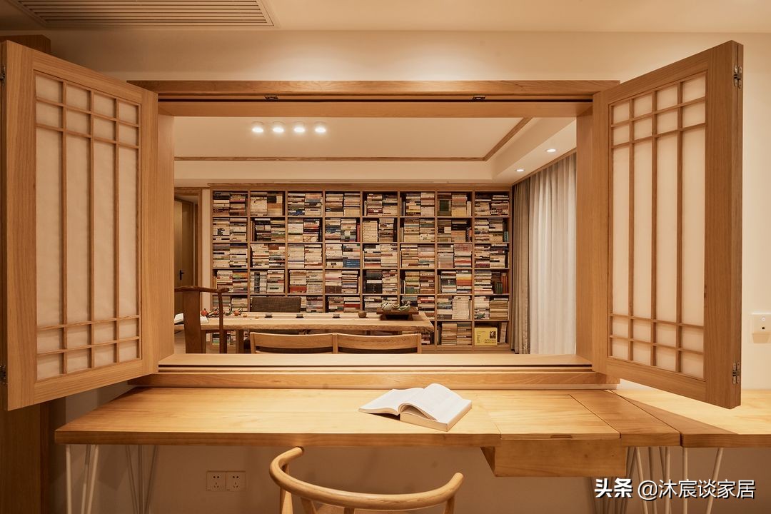 站在次臥看向客廳,一眼望去就是外面的大書架,這樣設計,讓兩個空間保持著聯繫,關起來又是兩個不同的空間。