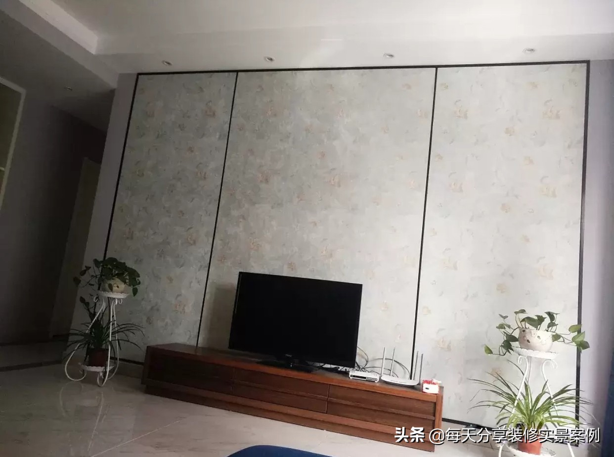 客廳電視背景牆貼牆布,沒有類似中式風格的感覺,貼了黑色線條做裝飾,顯得沒有那麼單調,而且不需要什麼造型,但是效果覺得還不錯,總比沒有電視牆那麼單調。電視櫃兩邊都擺放著綠植做裝飾。