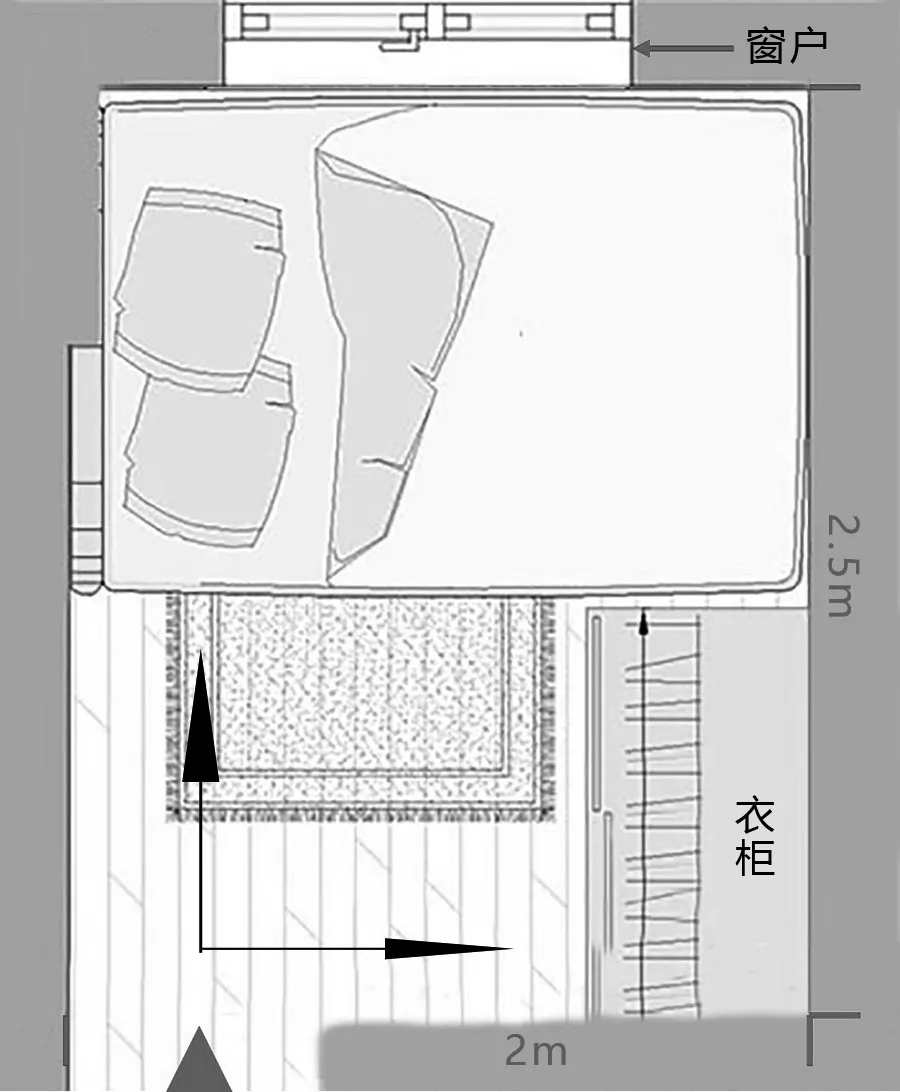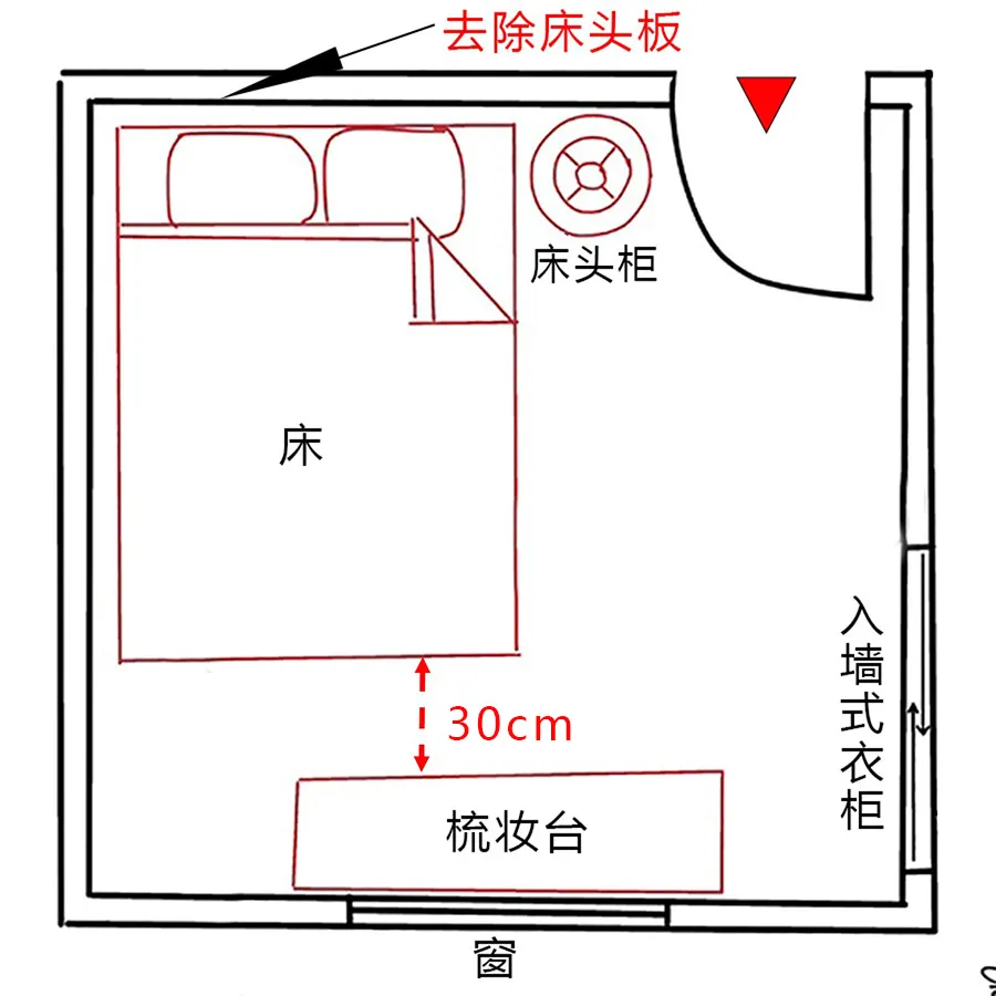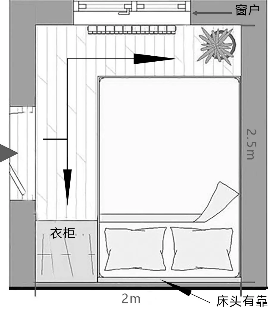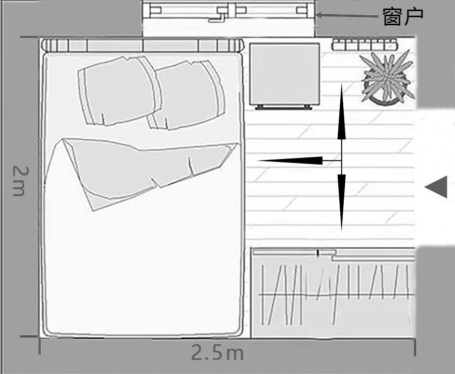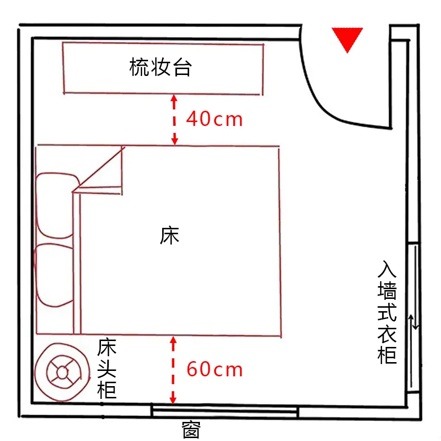 在考量完善梳妝台功能、床頭靠牆的風水問題,以及床鋪兩側都要有上、下床的通道…等需求之下,床與梳妝台采平行排列,但床鋪放在側牆的中間位置,如同下圖所示。好處是,不僅左右兩邊都有走道,梳妝台也能利用牆壁加裝收納工具,而且床頭櫃剛好放在左下角,充分利用了零碎空間。這種布局,是設計師相對比較推薦的排列方式。