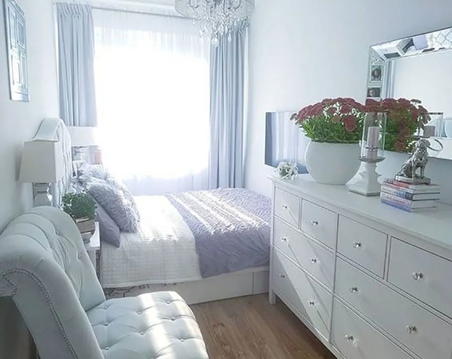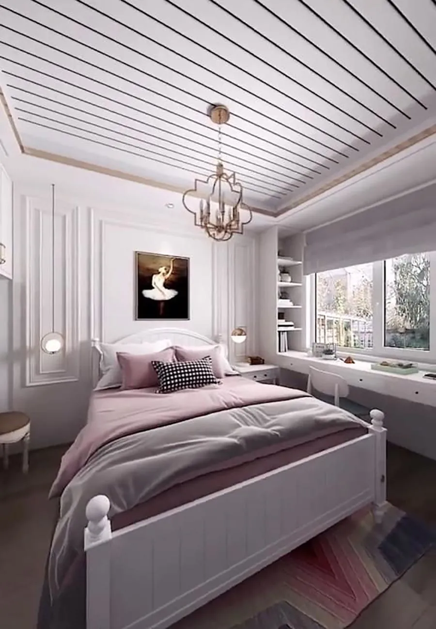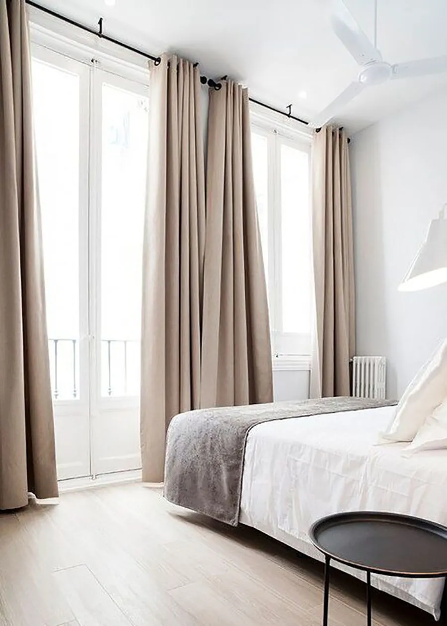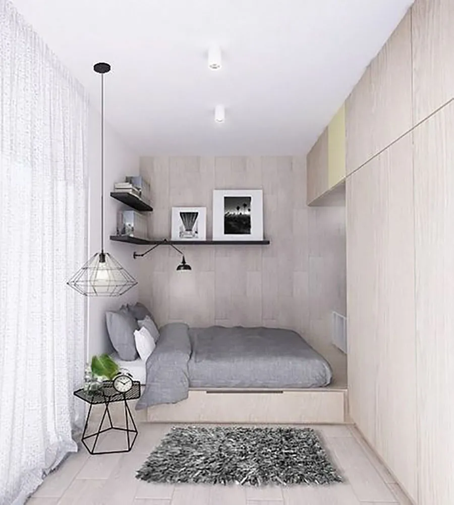 這是一種欺騙視覺感的做法;藉由窗簾吊掛於高處,讓較長的簾子發揮拉升空間的效果,產生更寬敞的錯覺。建議,窗簾的位置離天花板越近越好,而且長度最好接近地板;其次,應挑選單色、無圖案的款式,能讓小臥室更顯得簡單利落。