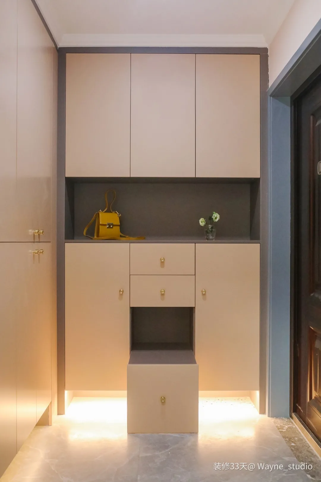 ▲ 玄關打造兩組懸空鞋櫃,底部配備燈帶方便收納常穿鞋,中部鏤空用於隨手放置包包、鑰匙等小件,將換鞋凳隱藏在櫃體中,實用還不占空間
