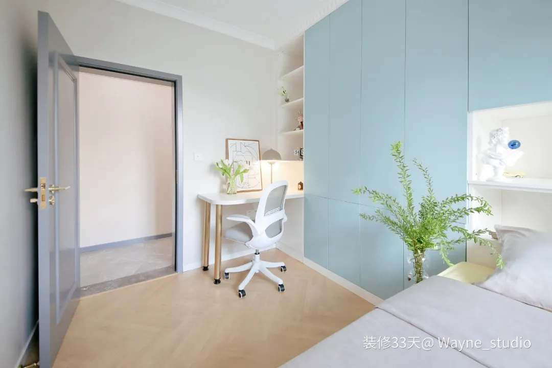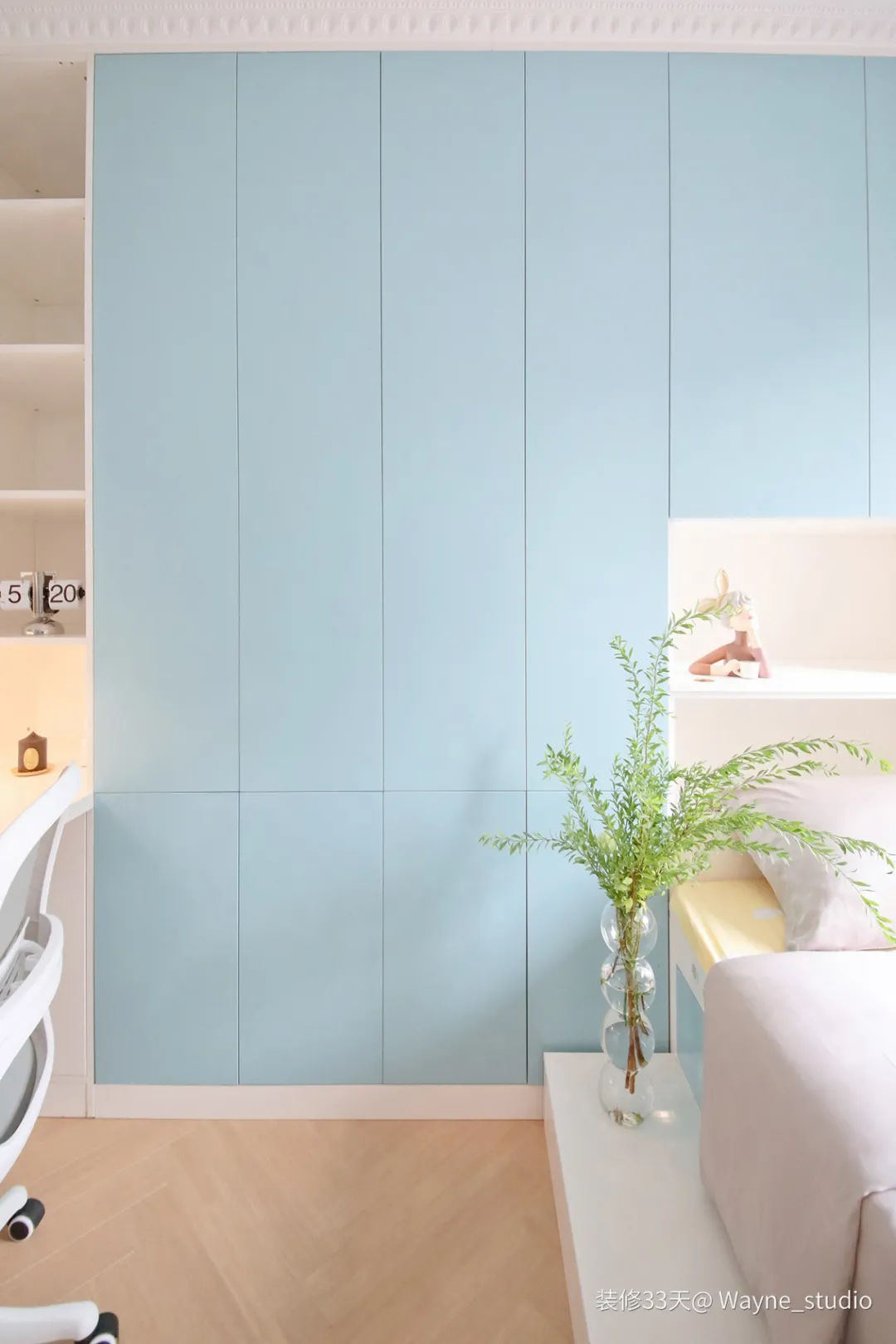 ▲ 兒童房以天空藍為基調,定制榻榻米與飄窗齊平,1.8米的床即使孩子長大了也能滿足使用
