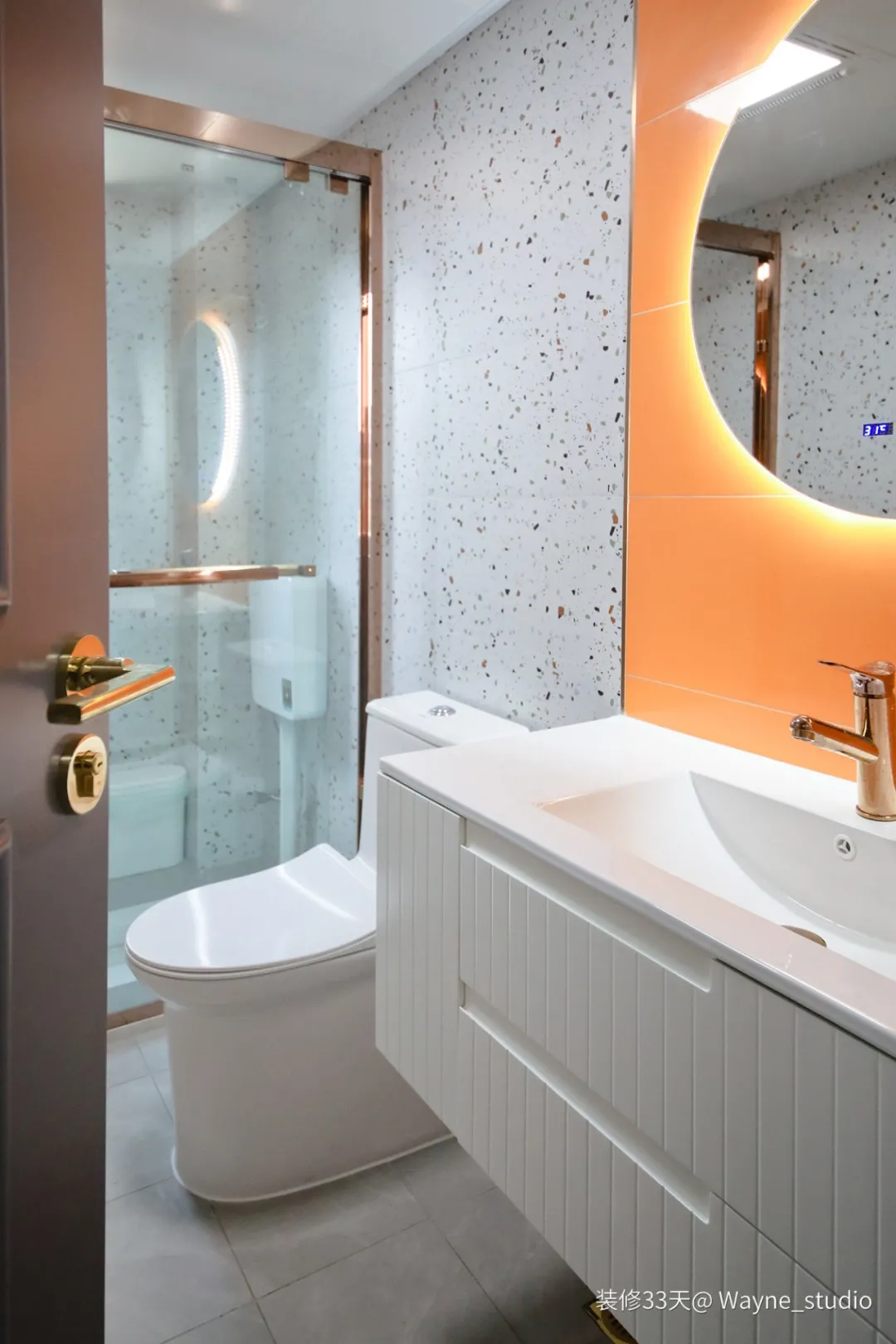 ▲ 客衛牆面鋪貼水磨石瓷磚,背景的一抹橘色提亮空間