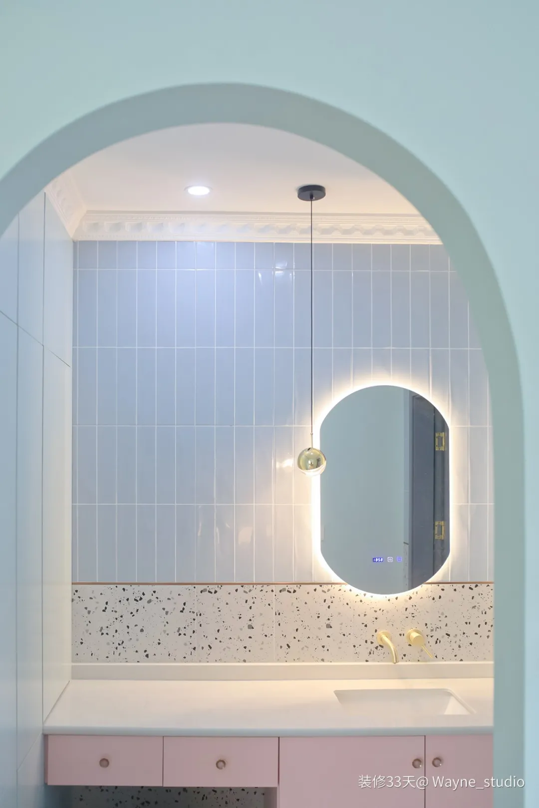 ▲ 主衛幹濕分離,定制加長浴室櫃兼梳妝台功能,藍色長條磚與粉色浴室櫃搭配,清新甜美