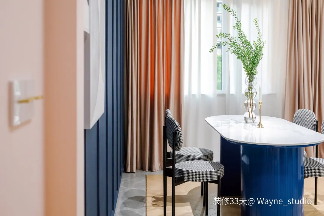 ▲ 餐廳,煙粉色與普魯士藍搭配,千鳥格餐椅點綴出時尚氣息
