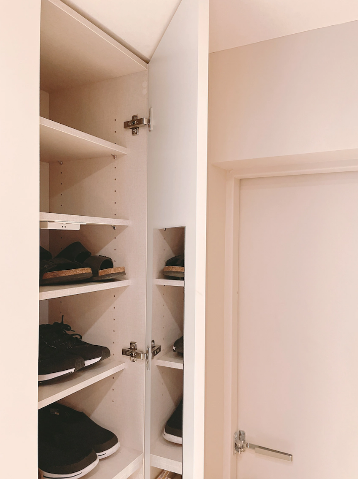 為了給孩子一個良好的習慣,玄關櫃側邊做了換鞋凳,進出門坐著換鞋也方便。