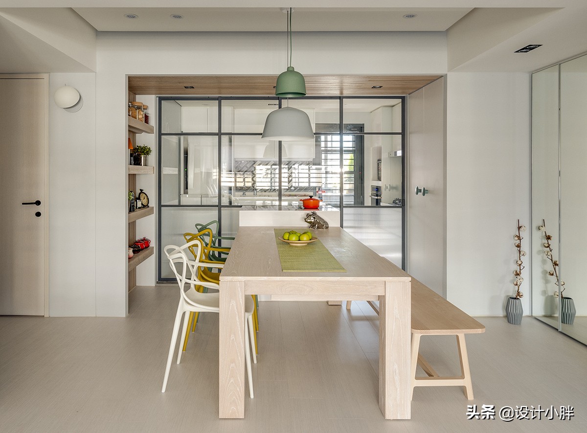 面對原本狹窄的餐廚規劃,設計師拆除了廚房與餐廳之間的隔牆,並讓渡部分女兒房空間,進而扭轉室內氛圍,成功讓陽台光線穿梭至廳區。