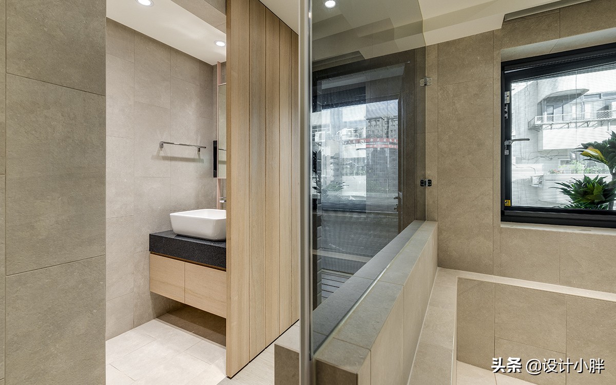 設計師以灰白瓷磚營造日系現代風,過道鋪敘木紋磚,兩側搭配黑色玻璃與木質隔斷劃分衛浴界線。