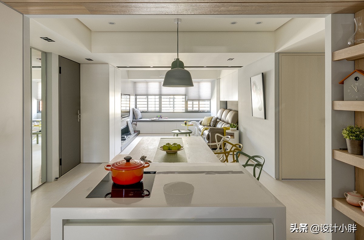 本案通過拆除卸餐廚隔牆,將女兒房畸零空間整合至廚房,串連前陽台與客廳采光窗,獲得開闊明亮視野,讓公共區域成為日光駐足流動的所在。